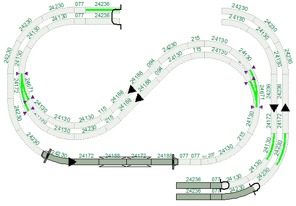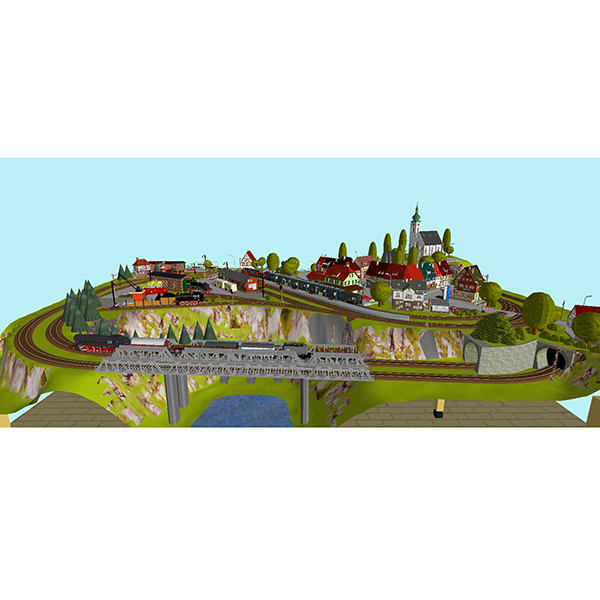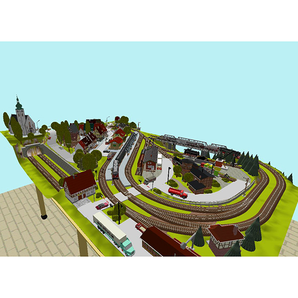 Auf 2,80 m2 (2000 x 1400 mm) gibt es Platz für insgesamt über 33 Laufmeter C-Gleis auf 3 Ebenen. Ein Schattenbahnhof ist vorhanden und im sichtbaren Bereich gibt es Bahnsteiglängen bis 130 cm.